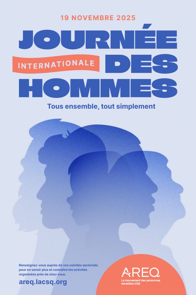 Depuis une quinzaine d’années, l’AREQ célèbre la Journée internationale des hommes et en fait la promotion. Cette année, l’Association a choisi de conserver le même thème qu’en 2024, à la suite d’une réflexion avec les responsables régionaux du dossier des hommes. Selon eux, ce thème demeure pertinent et d’actualité. Ainsi, à nouveau en 2025, l’affiche illustre des hommes de différents âges et de diverses origines ethniques. Tous photographiés de profil, ces hommes regardent vers un avenir moins sombre, tantôt parsemé de défis sur le plan de l’identité ou de la redéfinition de rôles sociaux, mais somme toute plus prometteur et marqué par la solidarité avec les femmes qui composent leur entourage.