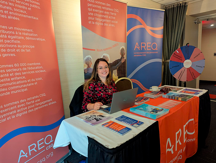 Dans les dernières semaines, l’AREQ a été présente à divers évènements dans l’objectif d’augmenter sa notoriété auprès des membres de la Centrale. En plus de présentations faites aux élus de la Fédération de l’enseignement collégial (FEC-CSQ) et de la Fédération de la santé du Québec (FSQ-CSQ), les membres de plusieurs syndicats ont pu découvrir avec enthousiasme les avantages d’adhérer à l’AREQ lors de leur prise de retraite. Parmi eux notons, l’Association des enseignantes et enseignants du Collège Durocher Saint-Lambert, l’Alliance des intervenantes en milieu familial – Montérégie et le Syndicat des professionnelles et professionnels de recherche de l’Université Laval.